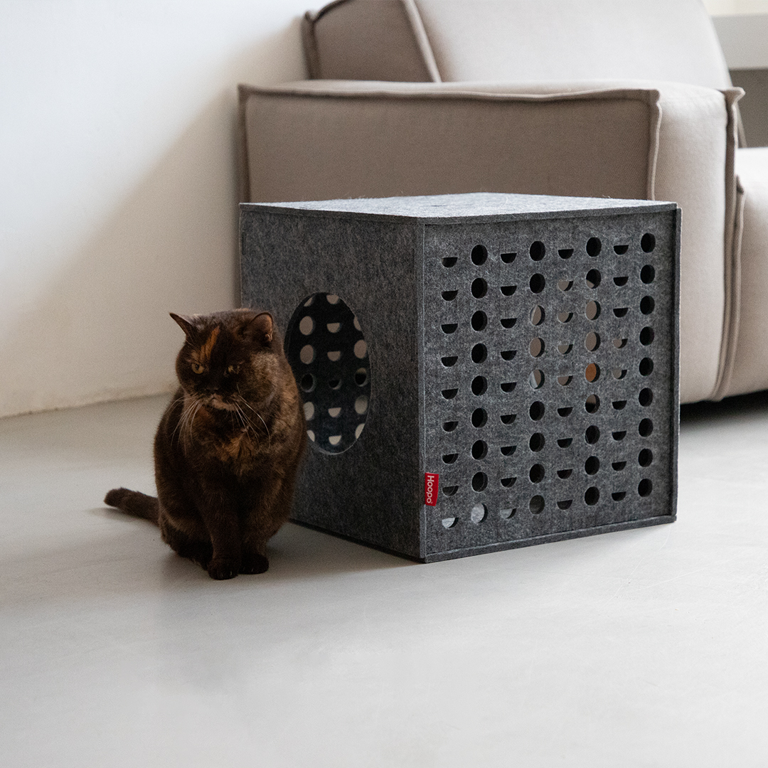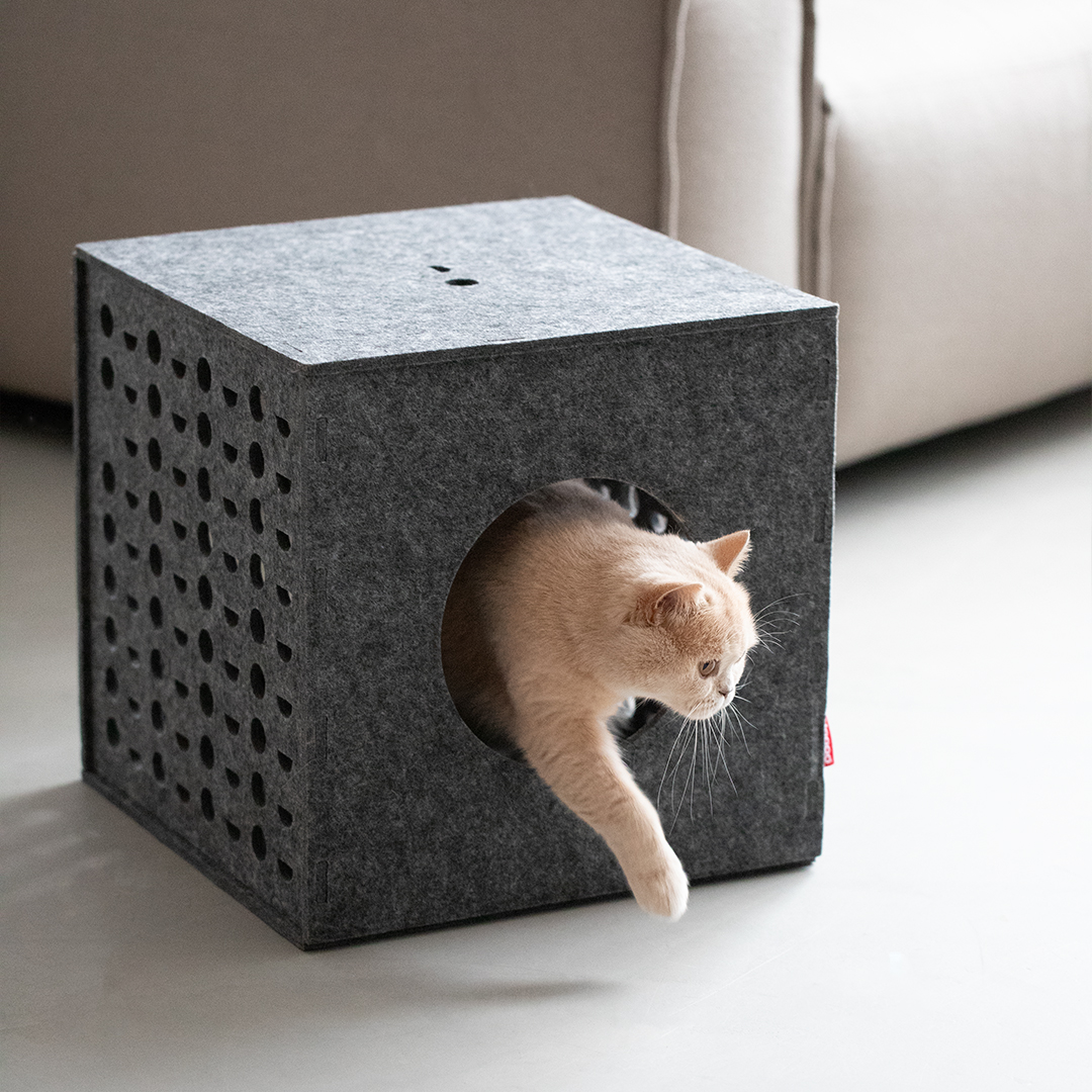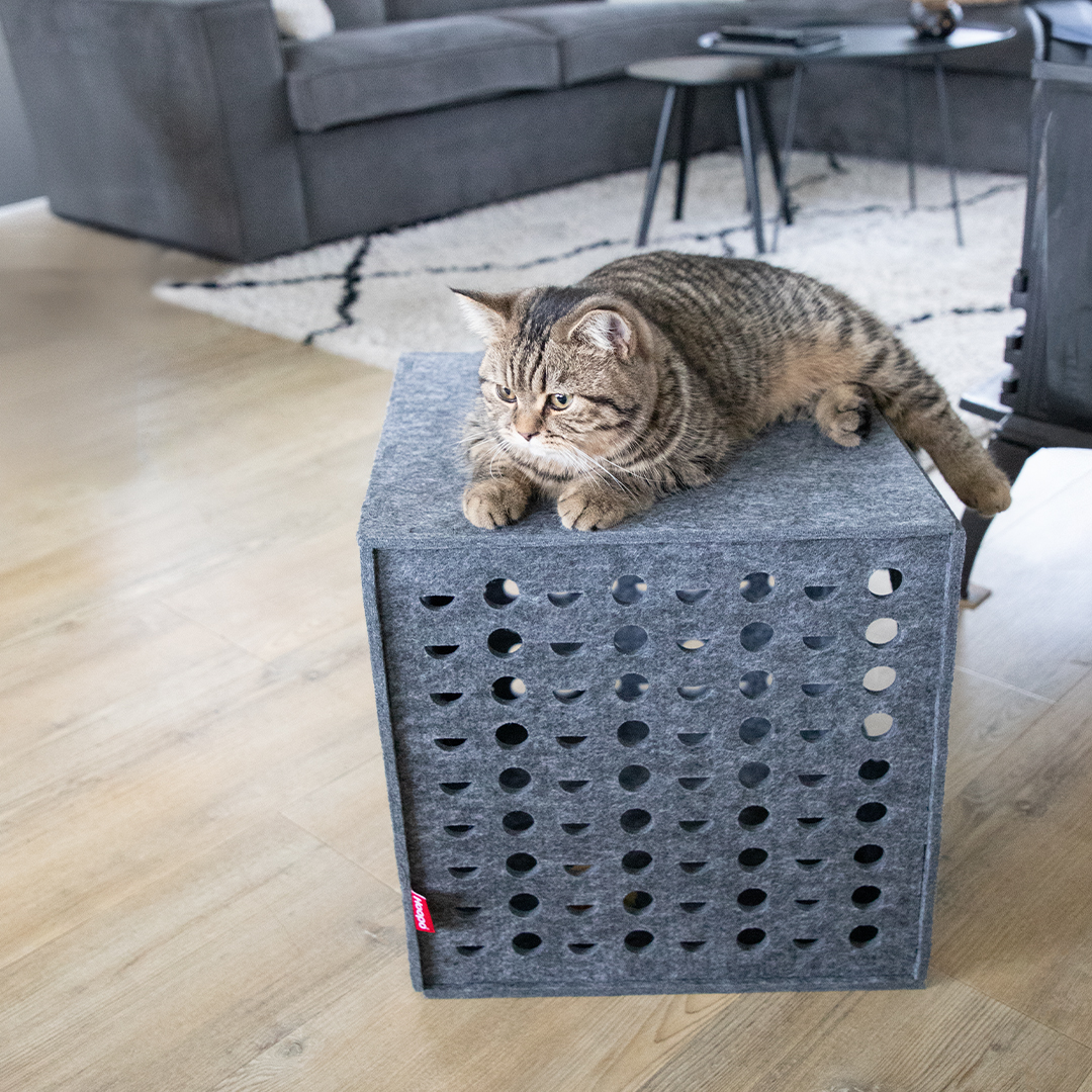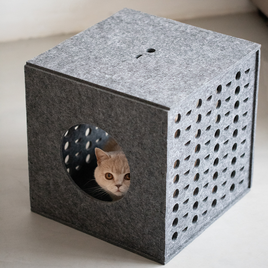 Diese Katzenhöhle bietet Deiner Katze das ultimative Spielparadies und Dir eine schöne Ergänzung für Dein Zuhause. Dieser stilvolle, leichte Spielwürfel aus Filz ist mehr als nur ein Spielzeug. Er bietet Deiner Katze ein sicheres Versteck und lädt dank der strategisch platzierten Gucklöcher zu spannenden Jagdspielen ein. So fühlt sich Deine Katze immer sicher und hat die Kontrolle, so wie es die Natur vorgesehen hat. Der Cube lässt sich mit den praktischen Druckstreifen leicht zusammenbauen und ebenso leicht aufbewahren.