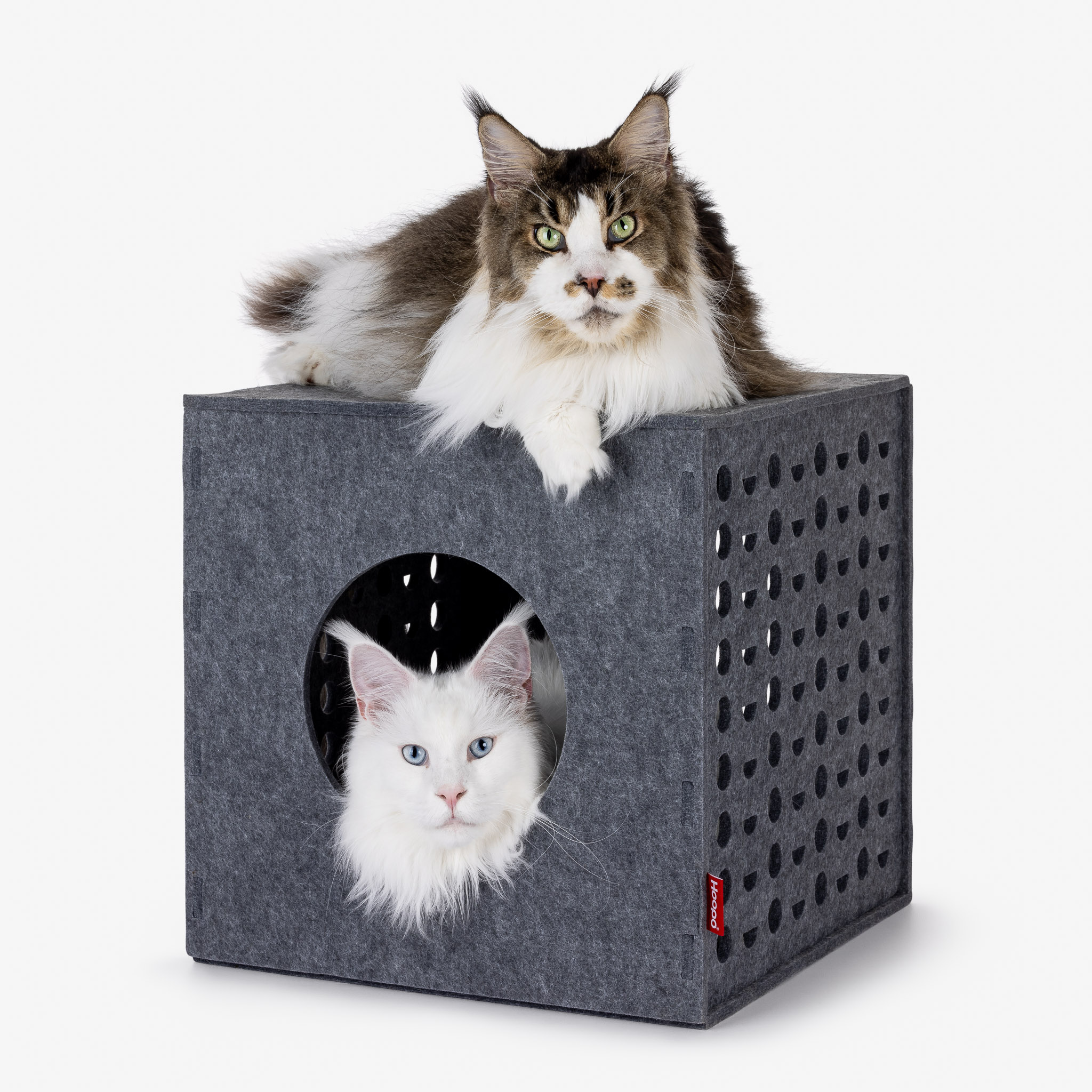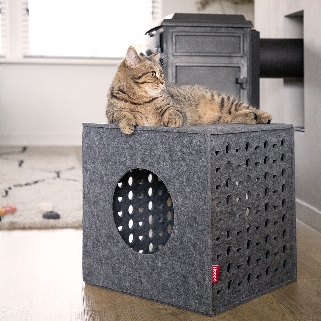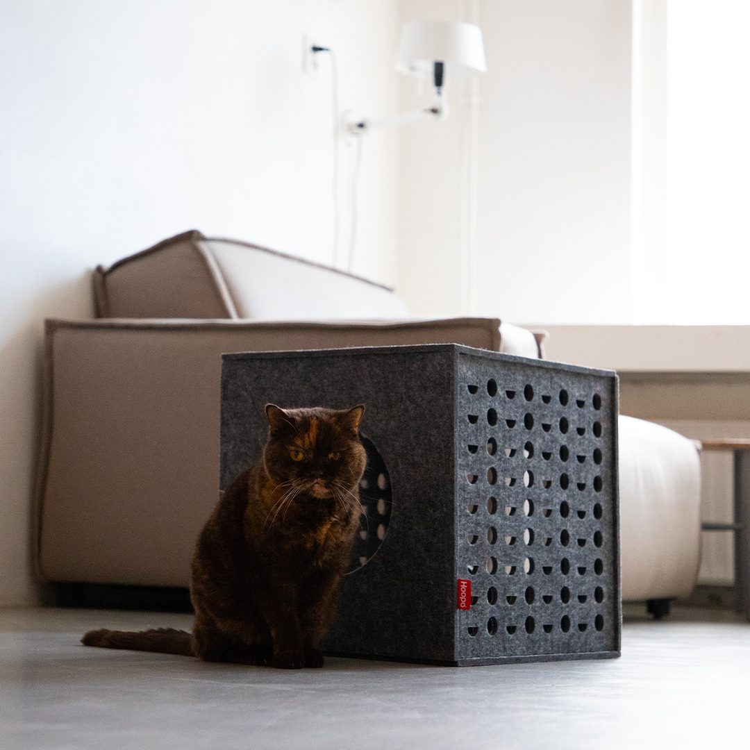 Diese Katzenhöhle bietet Deiner Katze das ultimative Spielparadies und Dir eine schöne Ergänzung für Dein Zuhause. Dieser stilvolle, leichte Spielwürfel aus Filz ist mehr als nur ein Spielzeug. Er bietet Deiner Katze ein sicheres Versteck und lädt dank der strategisch platzierten Gucklöcher zu spannenden Jagdspielen ein. So fühlt sich Deine Katze immer sicher und hat die Kontrolle, so wie es die Natur vorgesehen hat. Der Cube lässt sich mit den praktischen Druckstreifen leicht zusammenbauen und ebenso leicht aufbewahren.